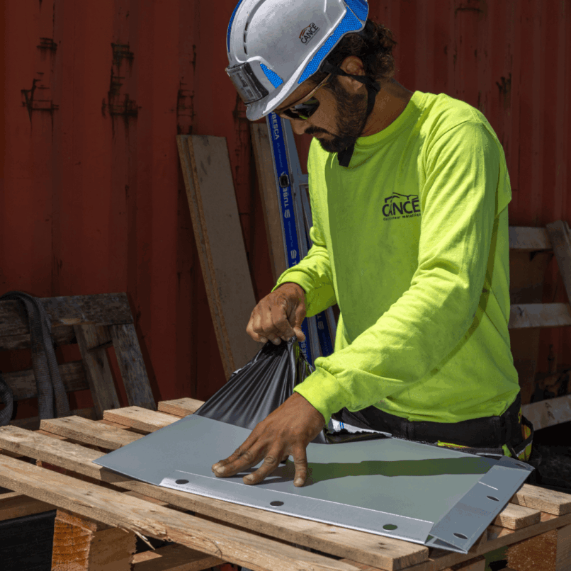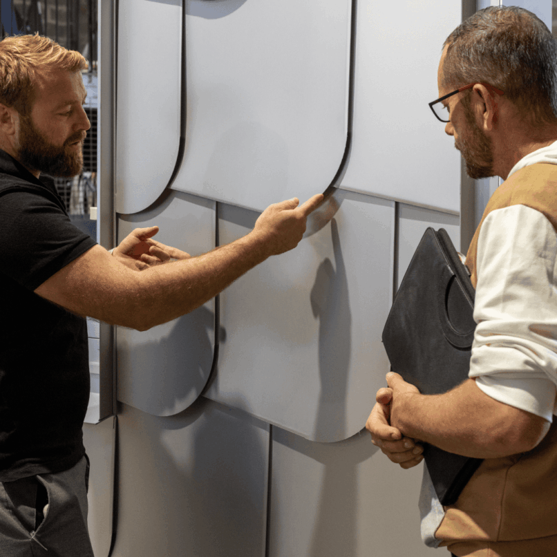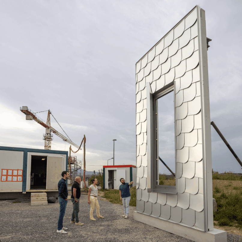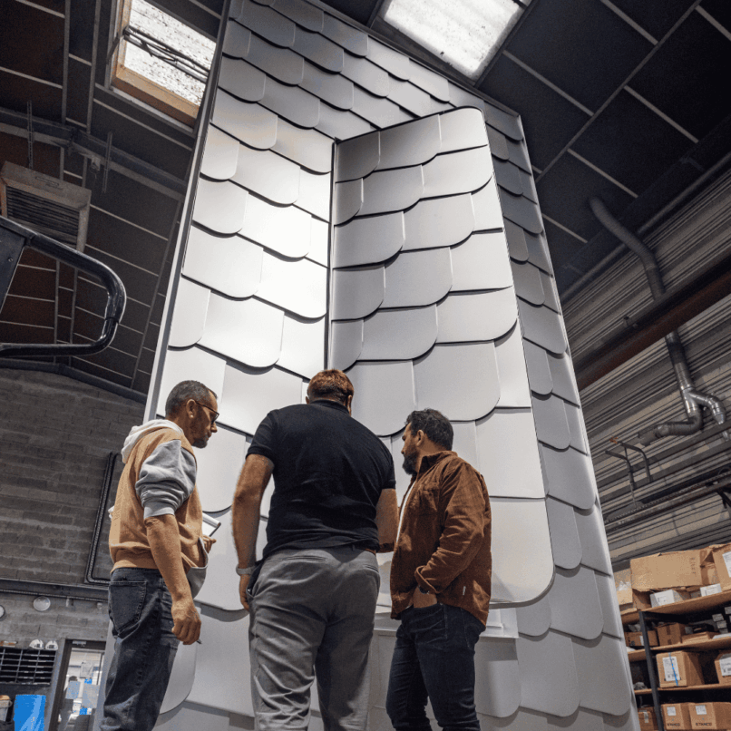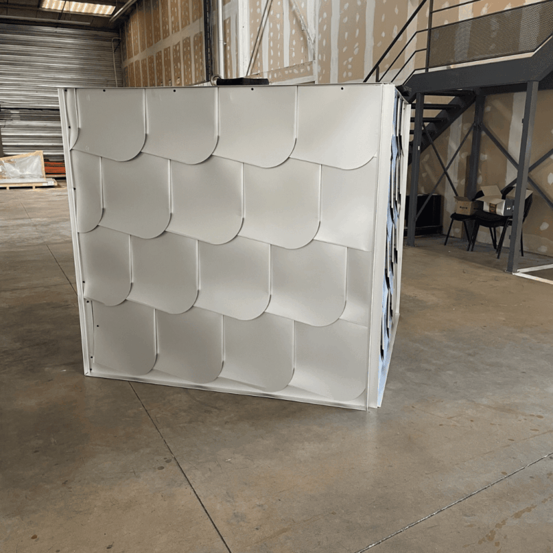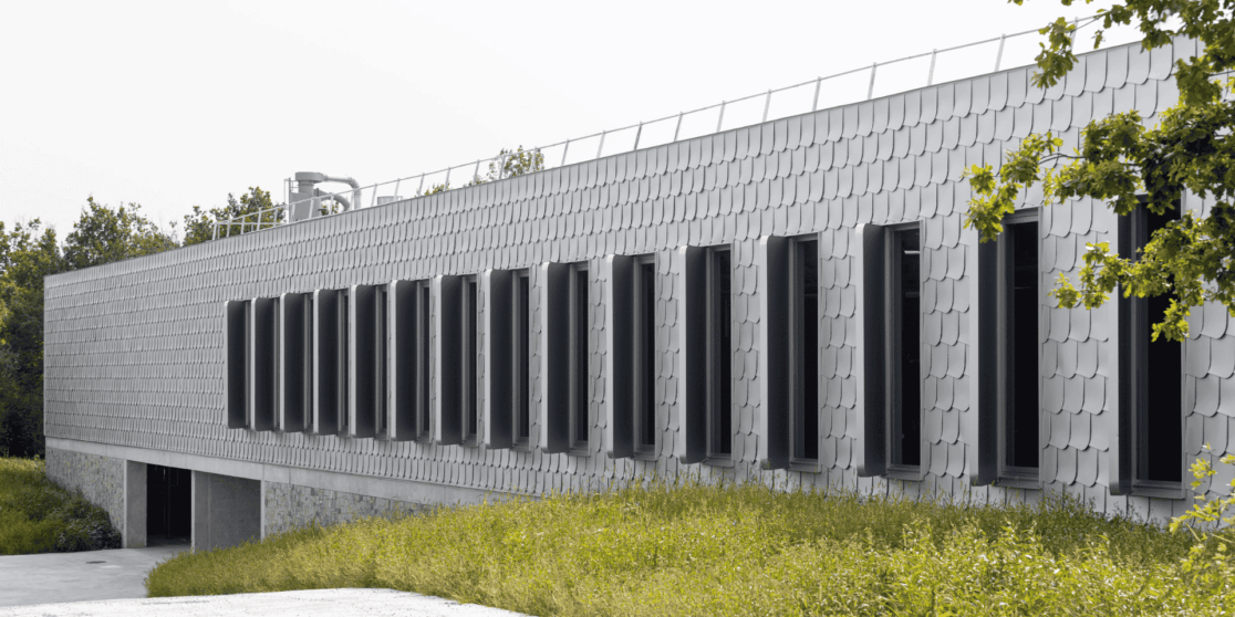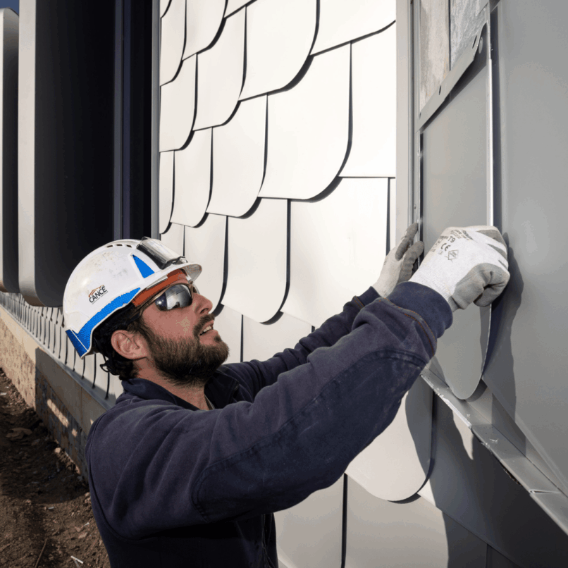 Le système ECAILLES est un système de bardage spécifique de plaques se chevauchant en léger décalage les unes par rapport aux autres pour donner un aspect d’écailles à la façade. Le système se compose d’un parement plan aluminium fixé sur un profil de bardage double peau, faisant office de support de montage des Ecailles et de pare pluie.