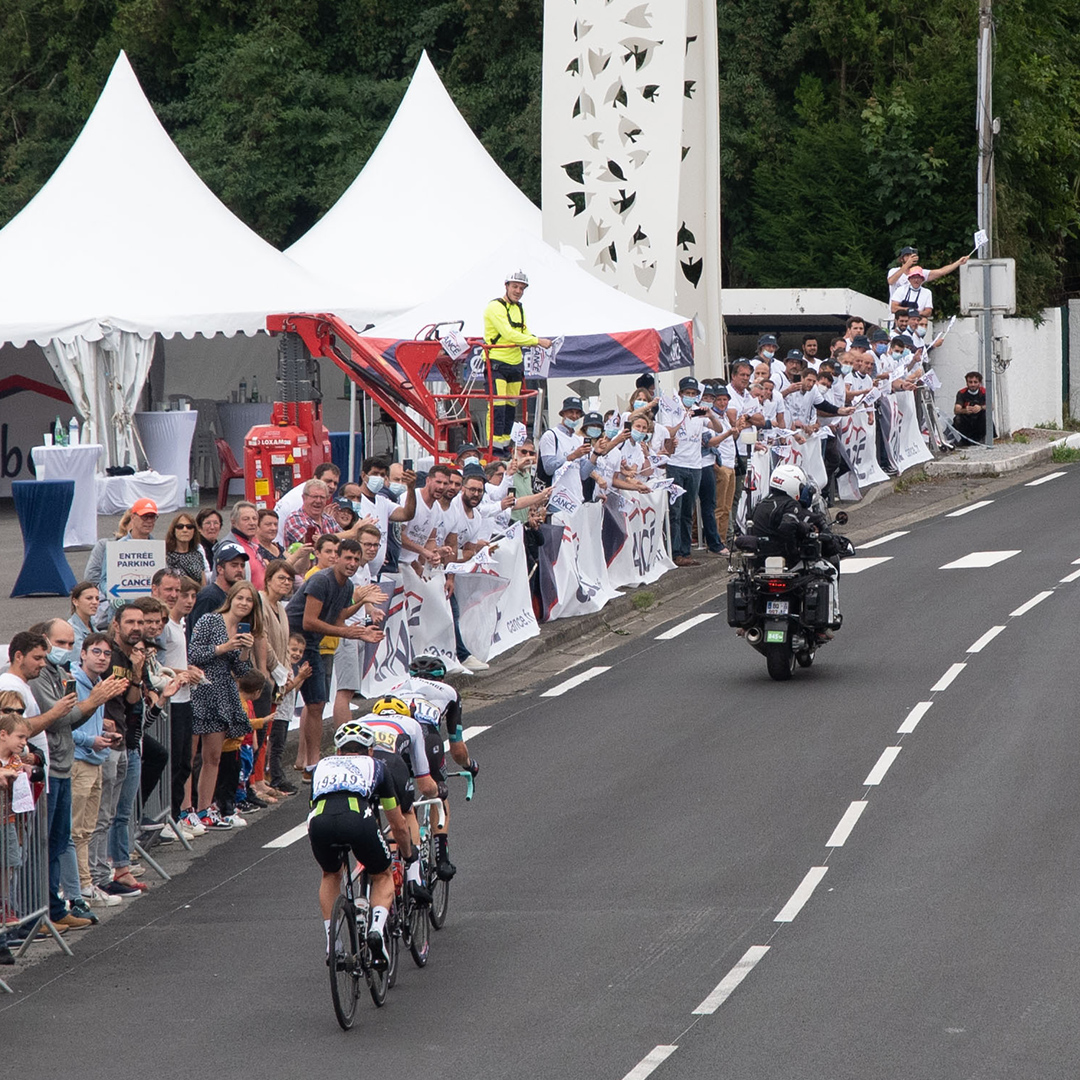 Après la caravane et la pause déjeuner, place à l’épreuve sportive. L’arrivée des 144 coureurs au départ de l’étape a été bien évidemment le point culminant de l’événement. La nervosité de l’étape était palpable au passage devant notre siège. Matej Mohoric (Bahrain-Victorious), Sean Bennett (Qhubeka-Nexthash) et Chris Juul-Jensen (BikeExchange) étaient déjà échappés. Ils étaient suivis de près, pour le régal des nombreux sportifs chez CANCÉ, par Julian Alaphilippe (Deceuninck-Quick Step) et Pierre-Luc Périchon (Cofidis). Enfin le peloton finit par sortir du rond point de la piscine où l’on aperçoit, presque timidement, celui qui gagnera l’étape du jour et le Tour, Tadej Pogacar (Uae Team Emirates).