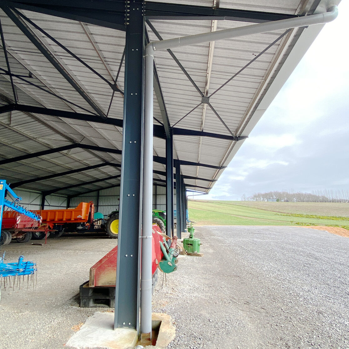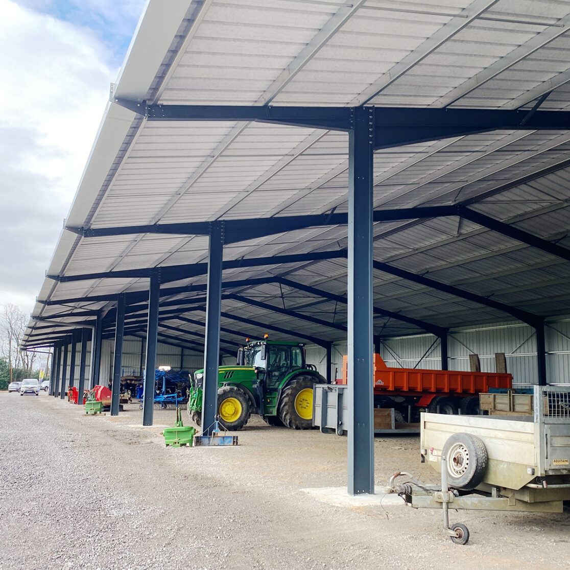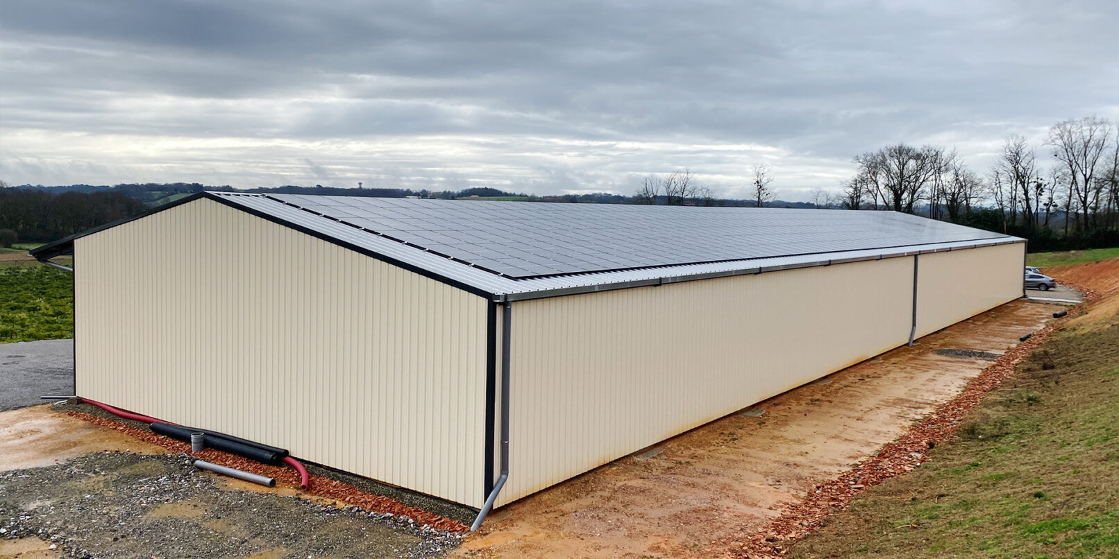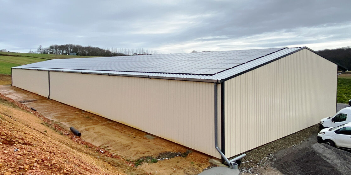 Charpente, couverture et bardage d’un bâtiment agricole photovoltaïque. Hangar à toiture symétrique semi-ouvert. Dimensions : 22 X 72 m. (Installation des panneaux solaires par Soltéa).