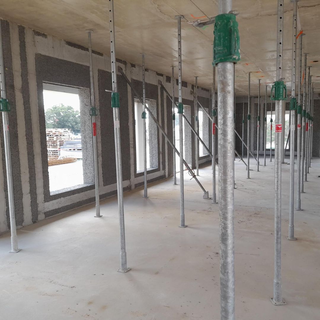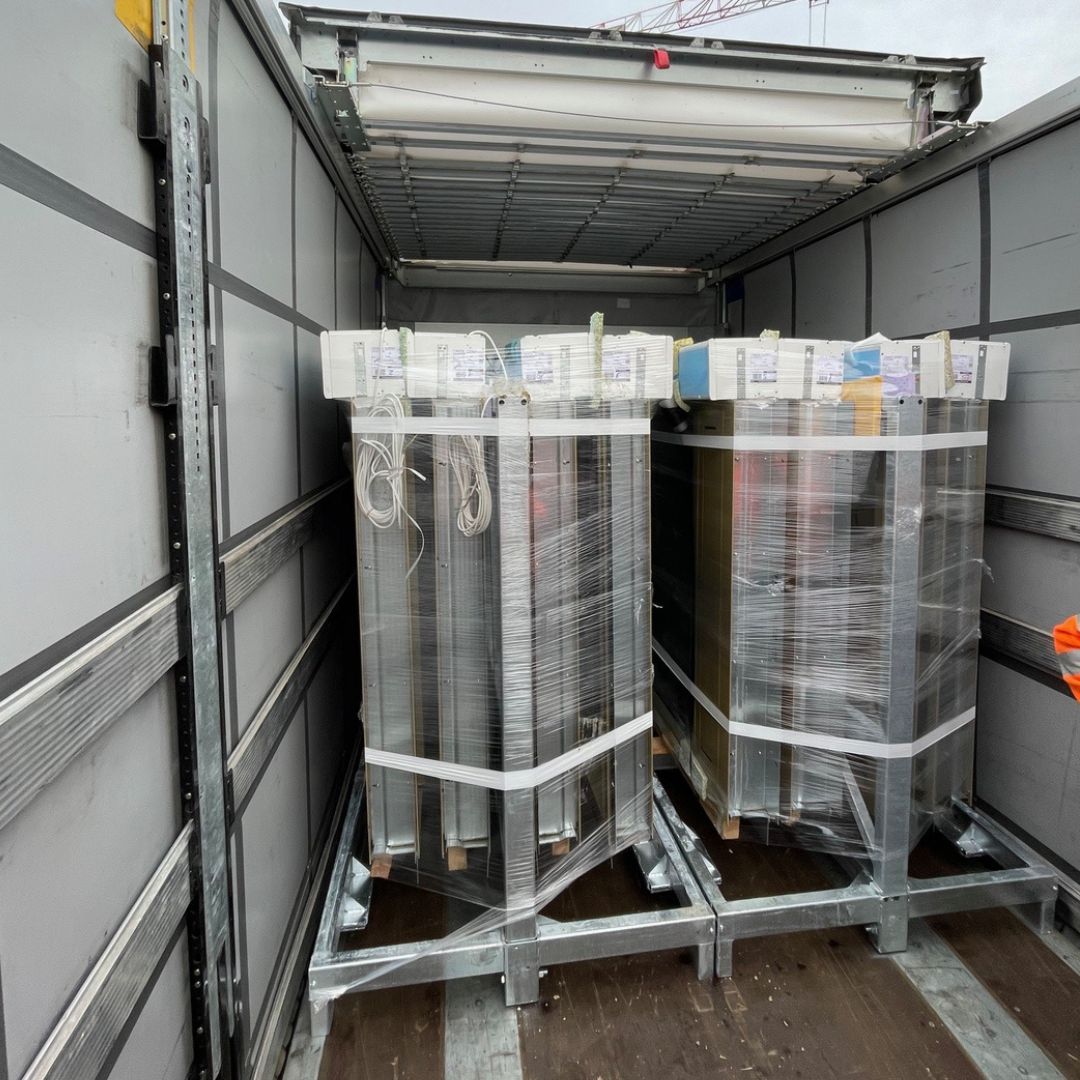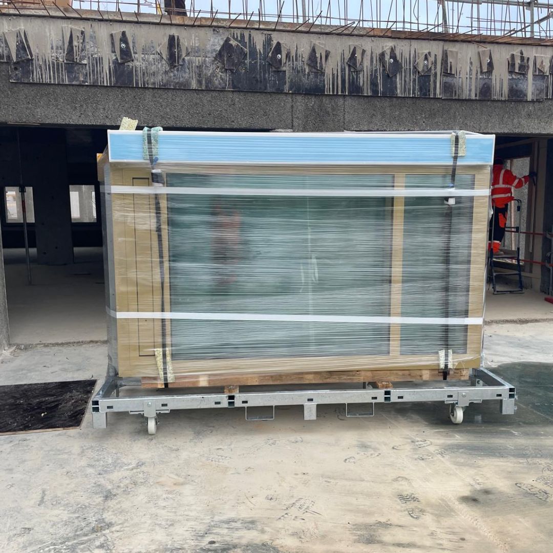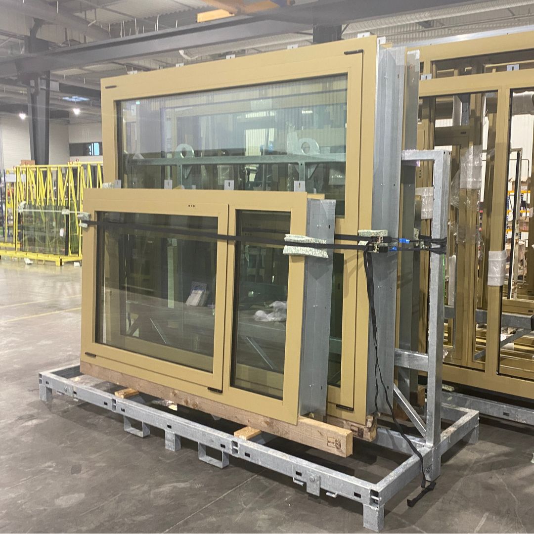 La logistique est un enjeu central de la fabrication hors site. Pour y répondre, CANCÉ a conçu sa propre solution : un rack en tubes carrés galvanisés, capable de transporter jusqu’à 4 menuiseries de 350 kg chacune, dimensionné avec précision pour s’ajuster à la largeur d’une semi-remorque. Ce conditionnement sur mesure garantissait une protection optimale des ensembles prémontés, aussi bien durant le transport que sur la zone de stockage. Lorsque les moyens de levage étaient disponibles, les racks transitaient même directement de la semi-remorque à la zone de pose dans le bâtiment.