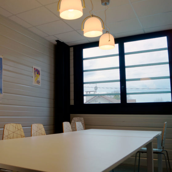 Enveloppant la structure métallique, un système de lames perforées permet d’avoir un éclairage naturel au R+1 sans avoir de chassis apparent. Ces lames, type Sauterne en acier laqué 10/10ème, permettent d’avoir un bardage plan à fixations cachées, c’est à dire une continuité complète de la façade tout en amenant une fonction brise soleil et apport de lumière.