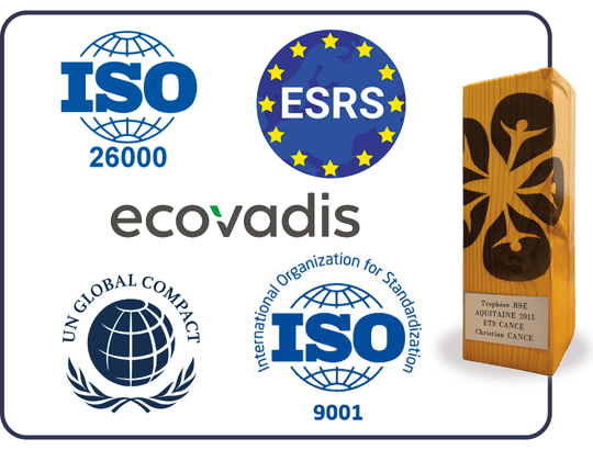 ✔️ Reconnue dès 2013 pour ses pratiques “achats responsables”, CANCÉ a structuré sa démarche RSE autour de l’ISO 26000, enrichie depuis 2024 par l’esprit et la méthode des standards européens de la CSRD. Habituée aux exigences de l’ISO9001, l’évaluation Écovadis constitue le support d’amélioration continue en matière de RSE, dont les résultats sont mis en perspective grâce à son adhésion au Pacte Mondial.