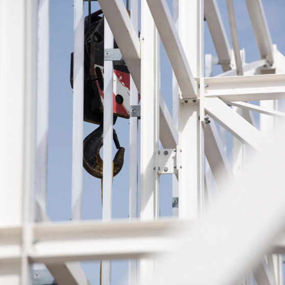 Structure métallique avec poutres treillis de 46 mètres de portée et 3 mètres de retombées / 9 poutres de 13 tonnes assemblées au sol.