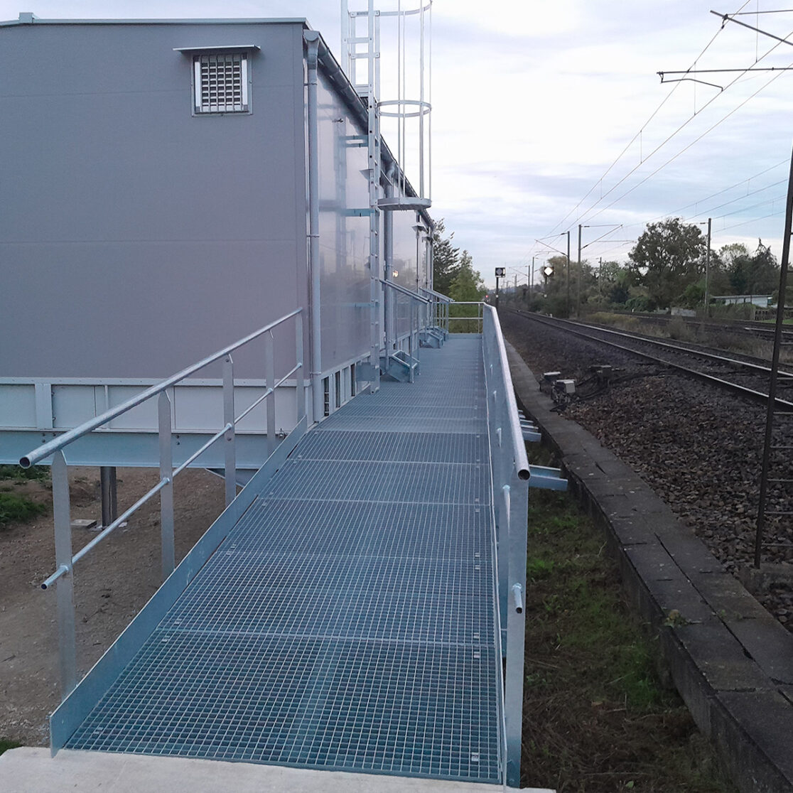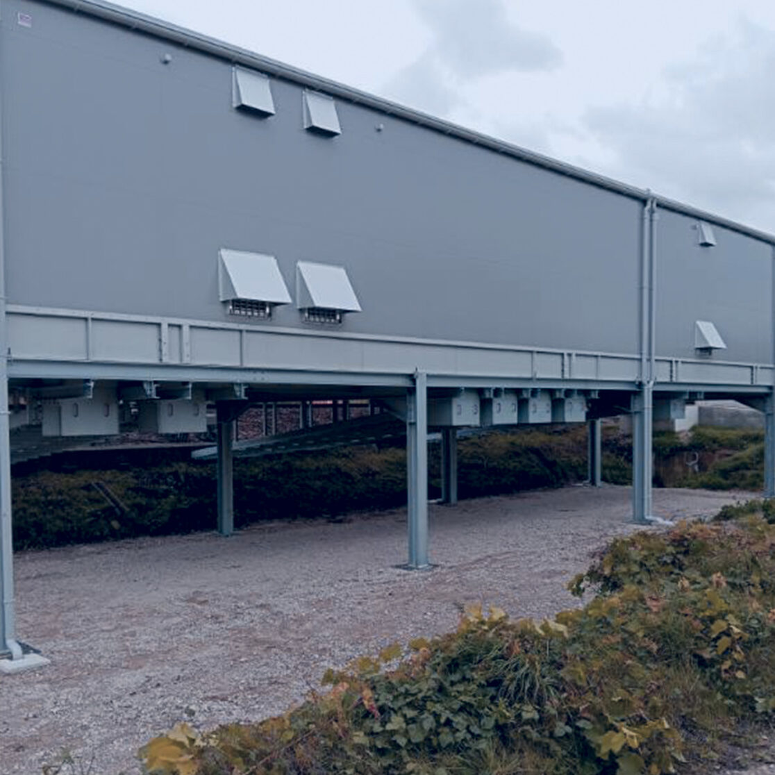 Plateforme métallique 6x18m, pour mise hors niveau d’inondation d’un bâtiment préfabriqué, avec passerelle en caillebotis, garde-corps, racks et caissons étanches sous la plateforme.